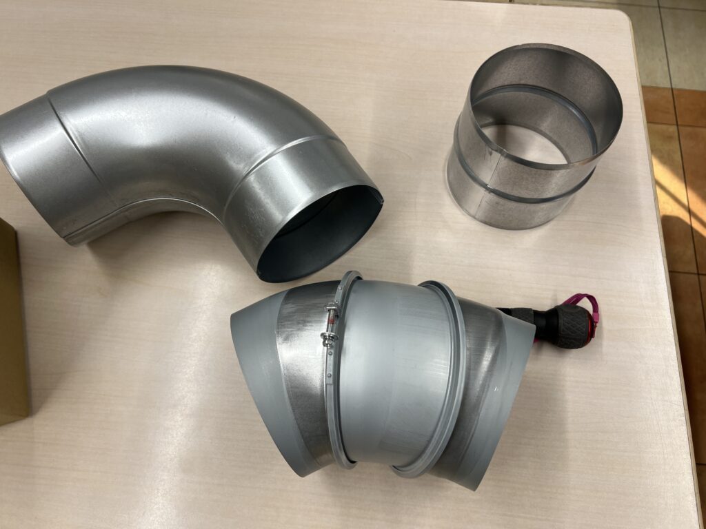 左から鋼板スパイラルダクト用エルボ、下は自在エルボ、右上はニップル(ジョイント)皆、鉄板出てきている