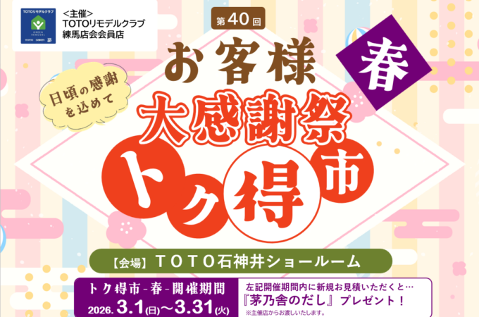 2025年9月6日(土)10:00〜17:00、練馬区のTOTO石神井ショールームにて「第39回お客様大感謝祭 トク得市 秋」を開催します。期間中(9...